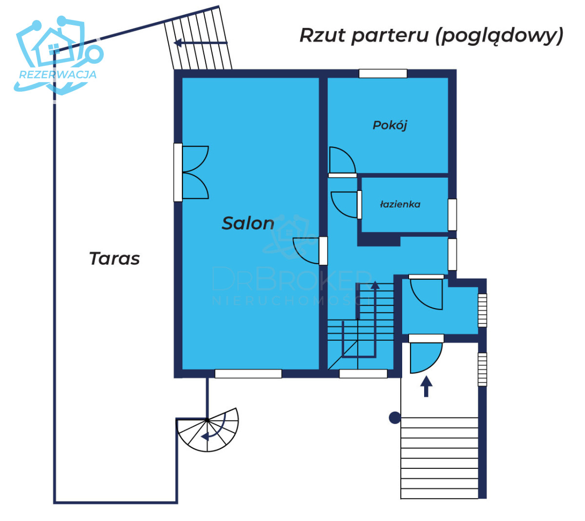 Salon z możliwością wykonania aneksu kuchennego, przestronny taras, pokój (gabinet lub sypialnia) , łazienka oraz hol i klatka schodowa