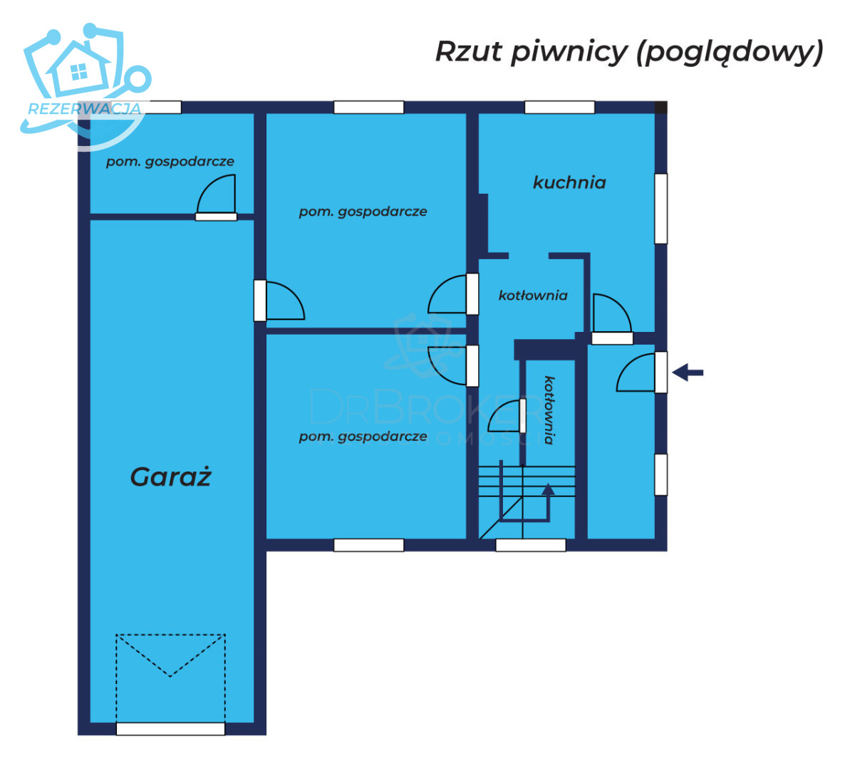 garaż, 2 pokoje, kuchnia, kotłownia, pomieszczenie gospodarcze oraz hol i klatka schodowa