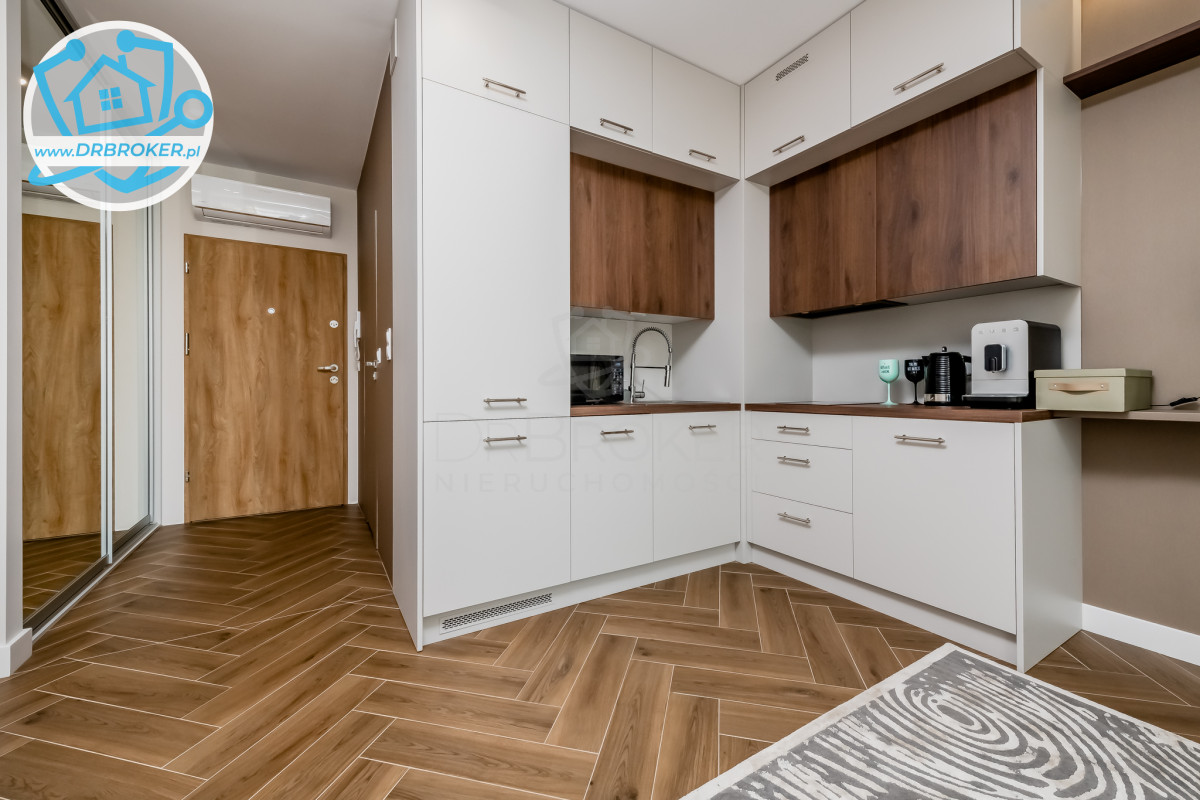 - Apartament - Przestronny, jednopokojowy apartament o powierzchni 28 m², usytuowany na pierwszym piętrze z dużym balkonem, skąd rozciąga się widok na zieleń. Funkcjonalny układ pomieszczeń obejmuje: