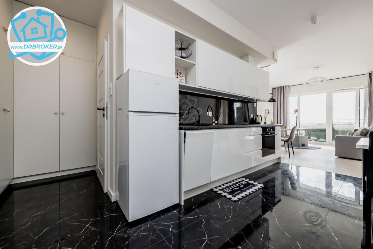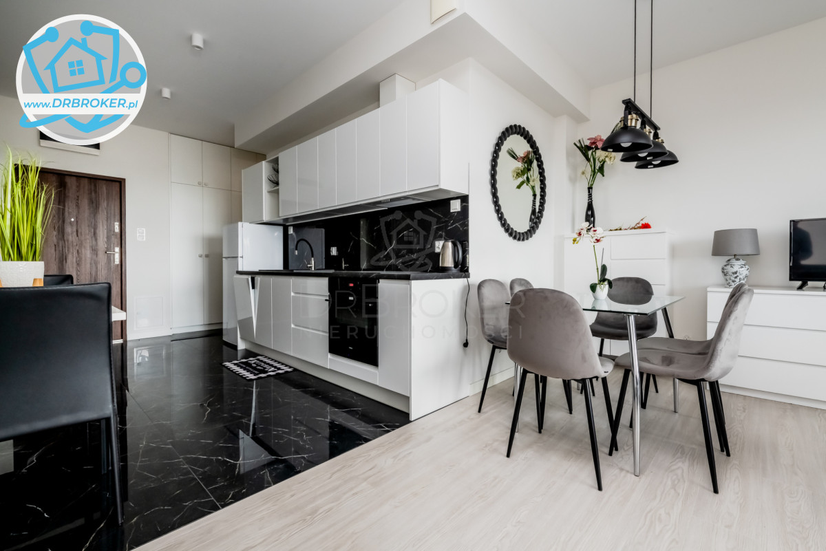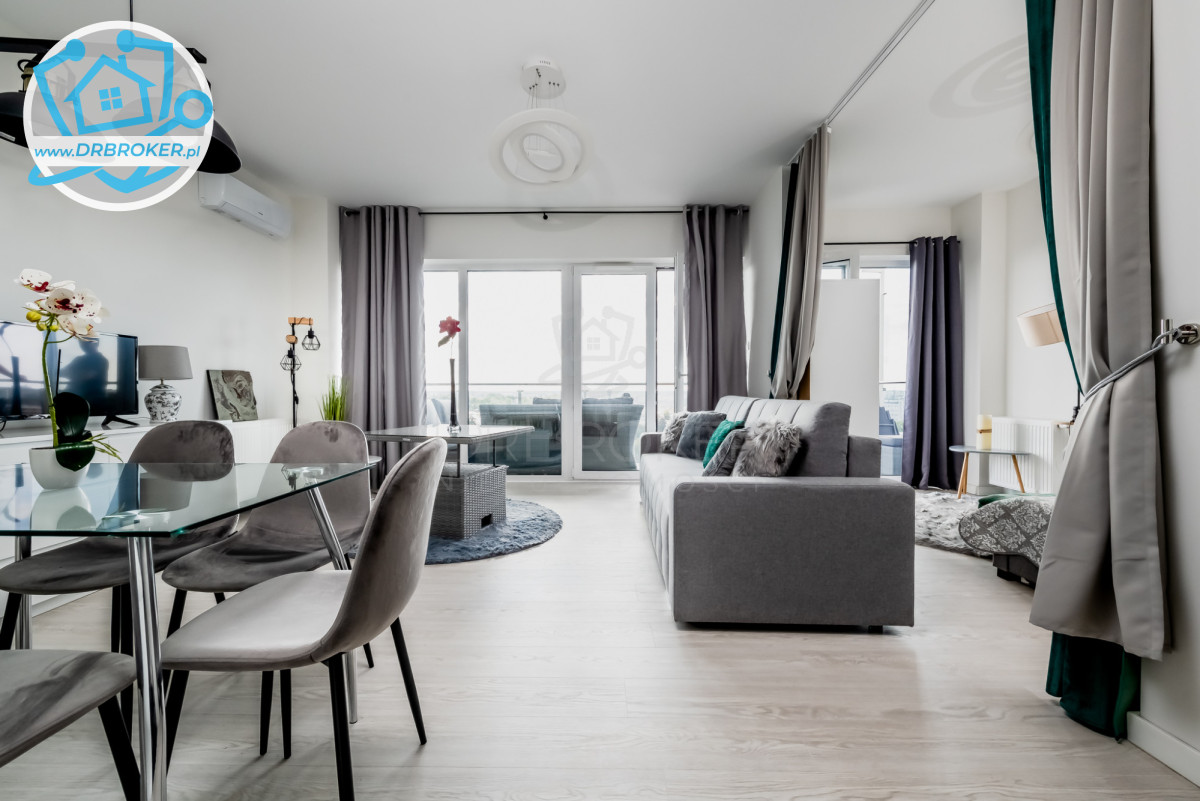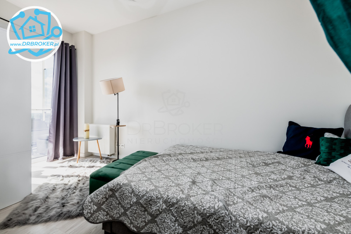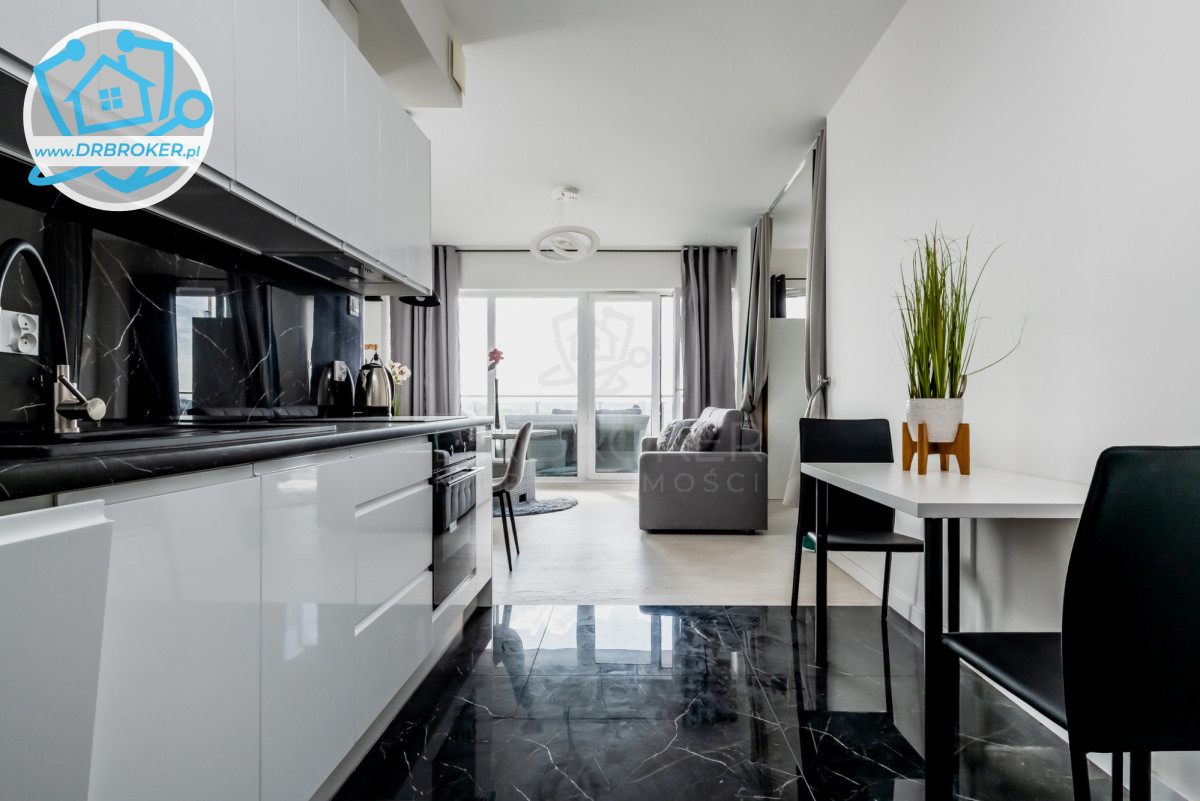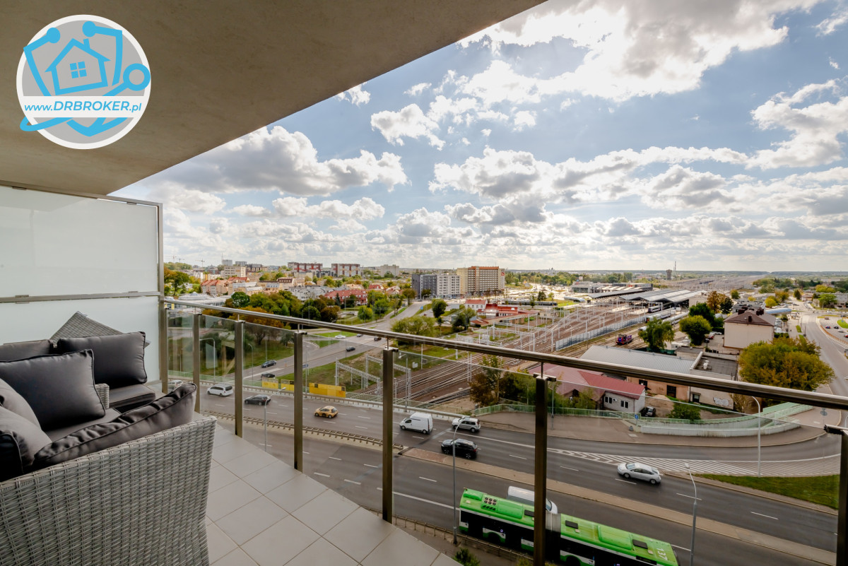 Lokal mieści się na 9, ostatnim piętrze nowego bloku, z 2024 roku. Składa się z pokoju dziennego z aneksem kuchennym, zintegrowanej z nim sypialni i łazienki. Przynależy do niego obszerny balkon (10,00 m2, 2 wyjścia) z widokiem na panoramę miasta. Jest nowy, gotowy do zamieszkania, wyposażony w niezbędne meble i sprzęt AGD/RTV, klimatyzowany