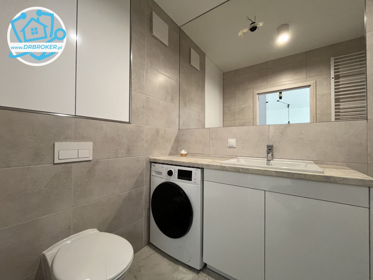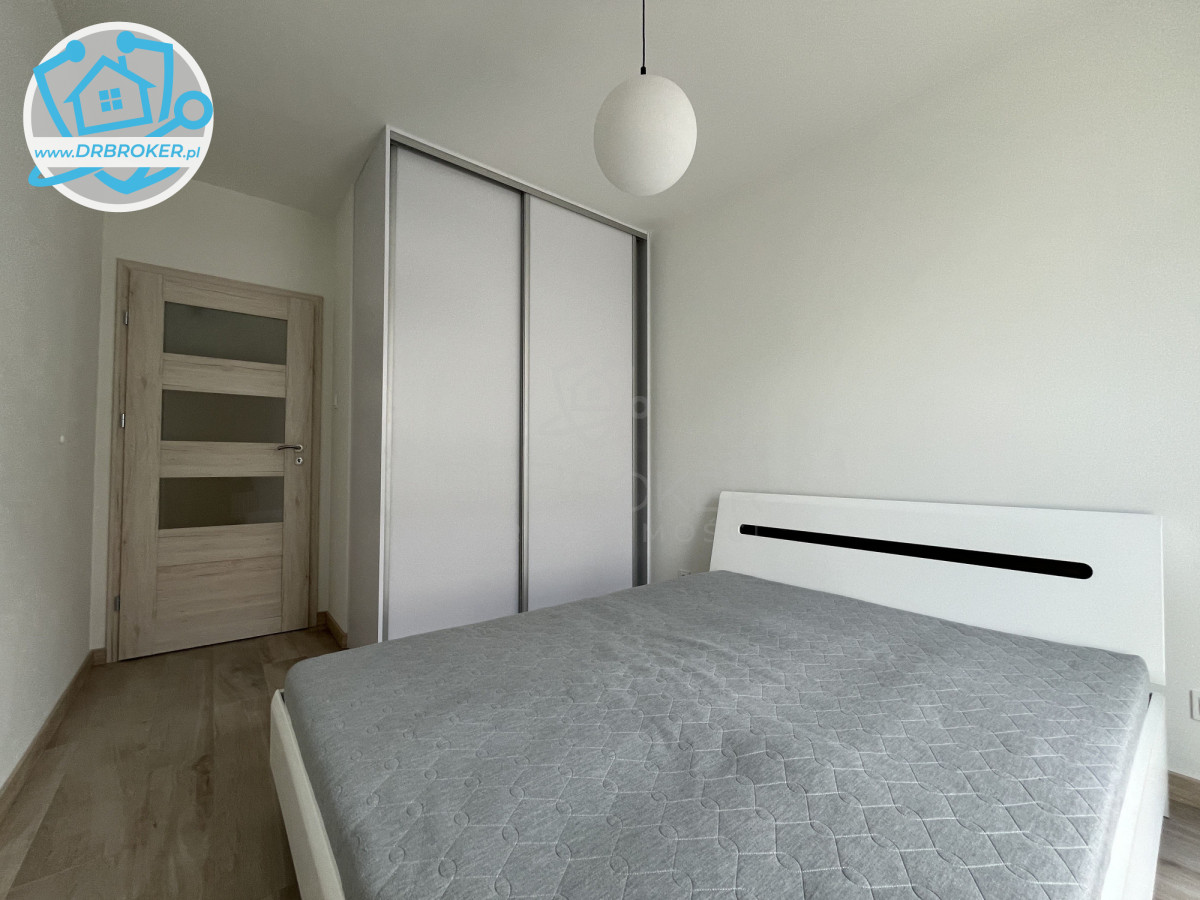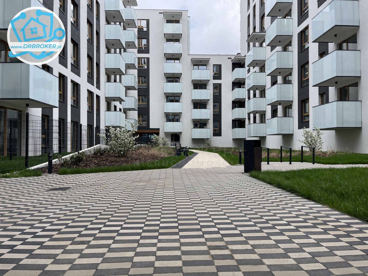 Lokal mieści się na 1 piętrze 7 piętrowego bloku z 2024 roku; składa się z pokoju dziennego z aneksem kuchennym, sypiali, łazienki (z WC) i przedpokoju; przynależy do niego balkon i miejsce postojowe w garażu podziemnym; jest wyposażony w niezbędny sprzęt AGD.